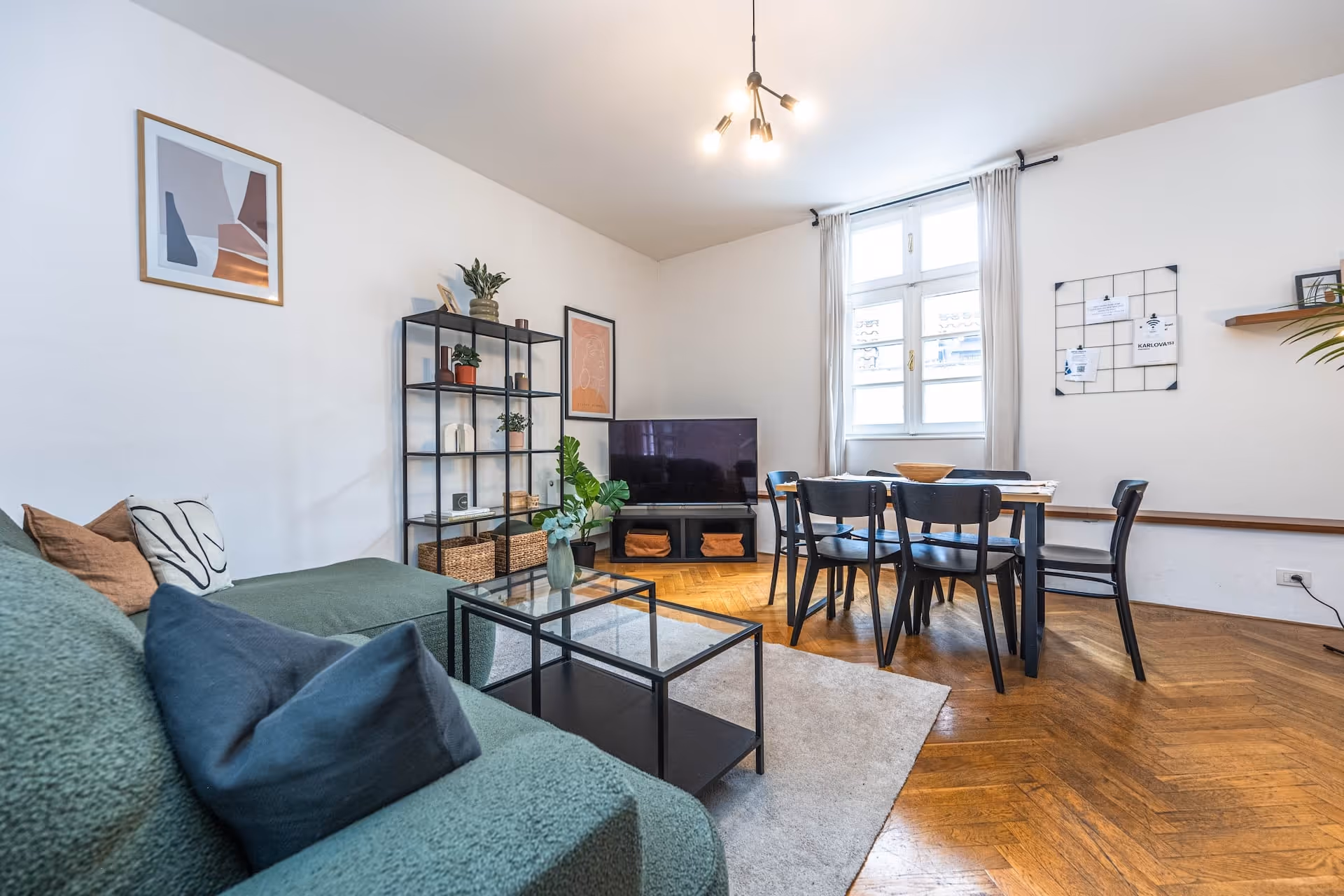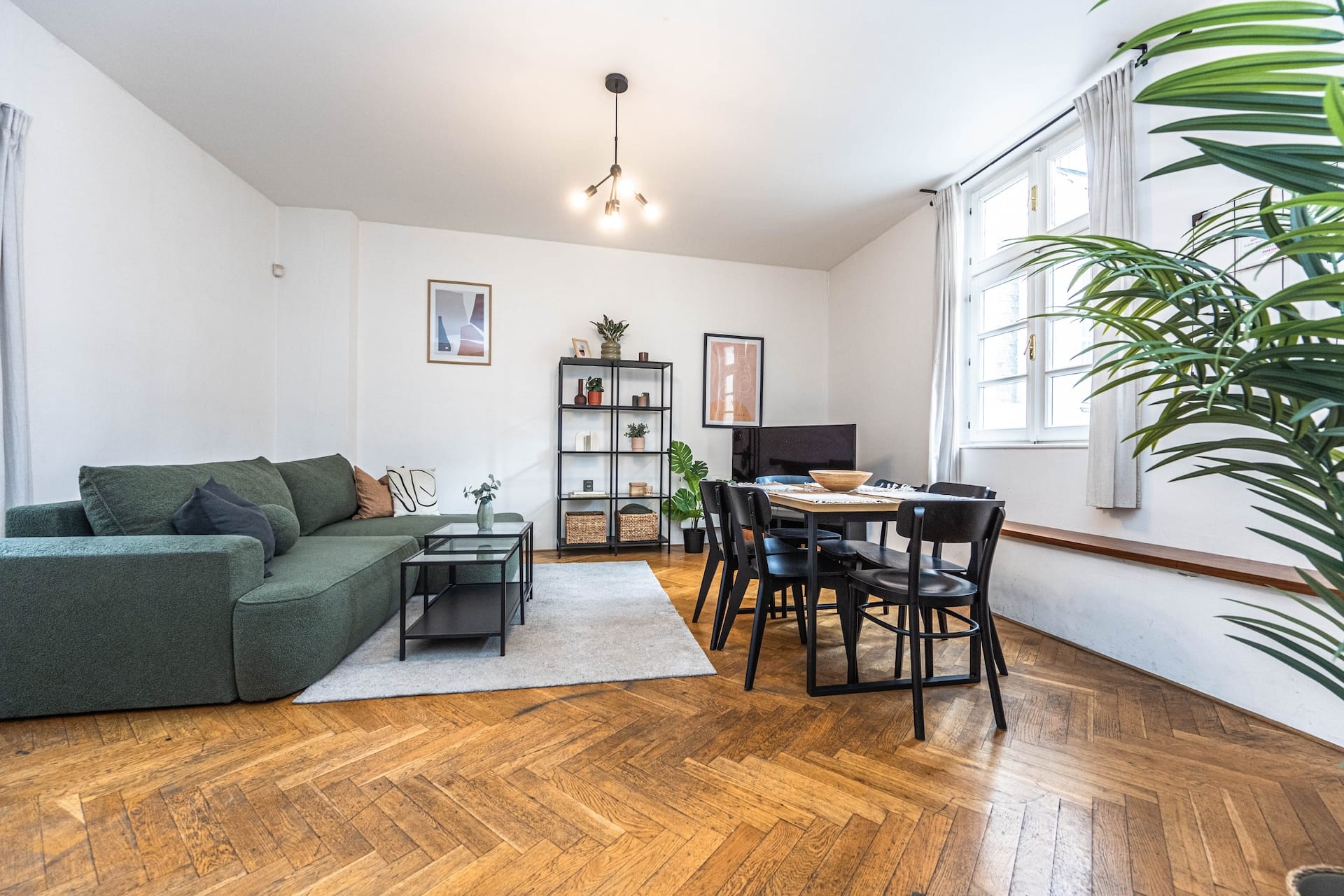 Tento duplex o rozloze 80 m2 se nachází v srdci Starého Města v Praze a nabízí 2 ložnice, plně vybavenou kuchyň a dva soukromé balkony.