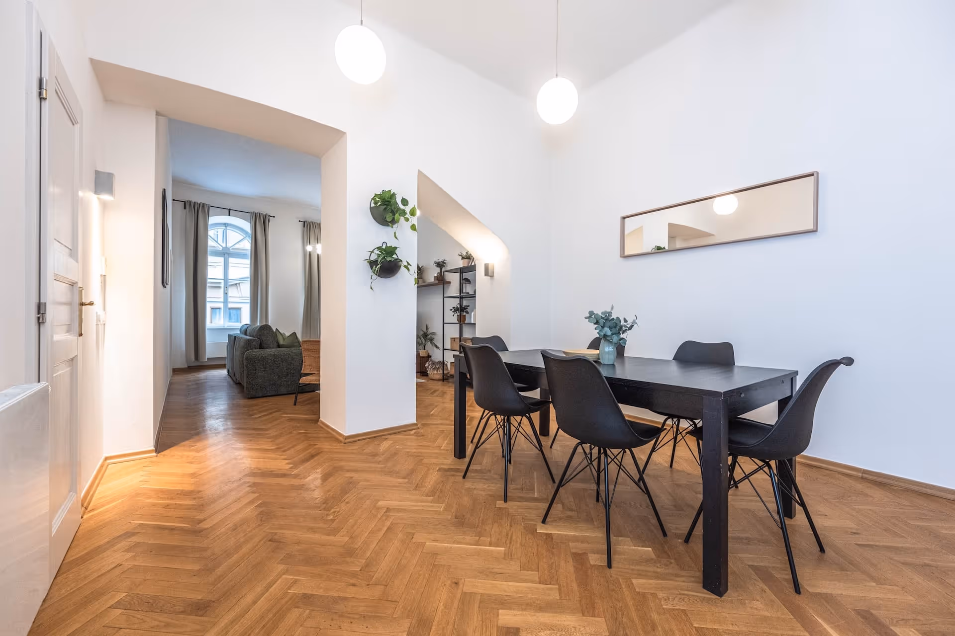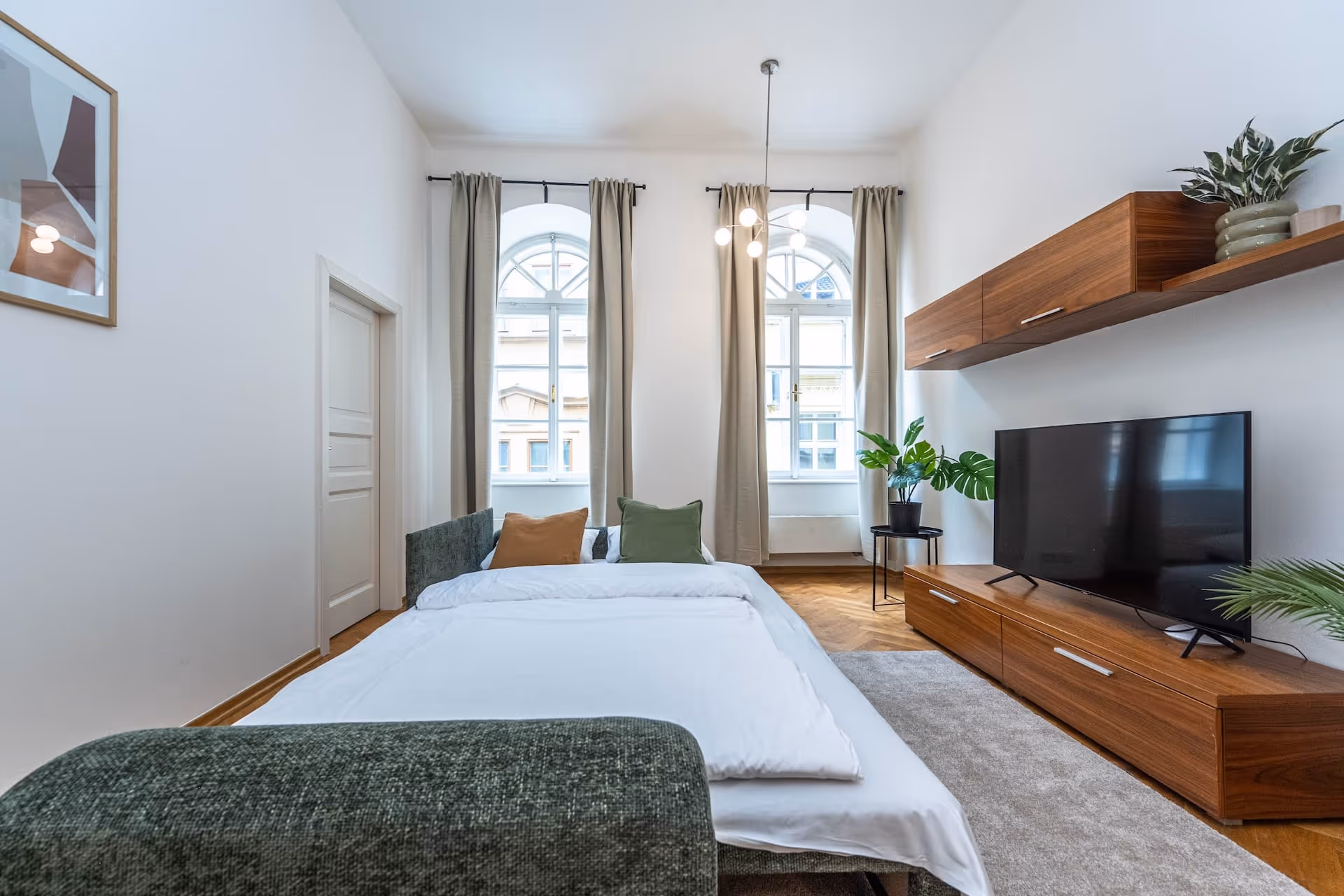 Tento apartmán s třemi pokoji o rozloze 80 m² přináší stylový design, který se harmonicky prolíná s bohatým dědictvím města. Nachází se ve druhém patře budovy s výtahem a nabízí promyšlenou dispozici. Dvě ložnice s manželskými lůžky a šatními skříněmi vytvářejí útulné útočiště. Příjemný obývací pokoj je vybaven pohodlnou pohovkou a vyhrazený jídelní kout přidává další úroveň komfortu během vašich jídel.