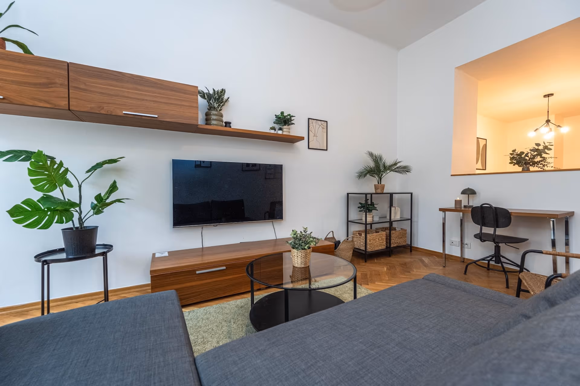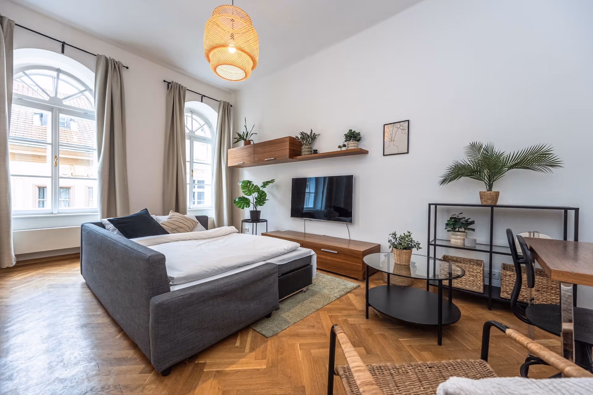 Tento apartmán s třemi pokoji o rozloze 84 m² přináší stylový design, který se harmonicky prolíná s bohatým dědictvím města. Nachází se ve druhém patře budovy s výtahem a nabízí promyšlený layout. Dvě ložnice s manželskými lůžky a šatními skříněmi vytvářejí útulné útočiště. Příjemný obývací pokoj je vybaven pohodlnou pohovkou a vyhrazený jídelní kout přidává další úroveň komfortu během vašich jídel.