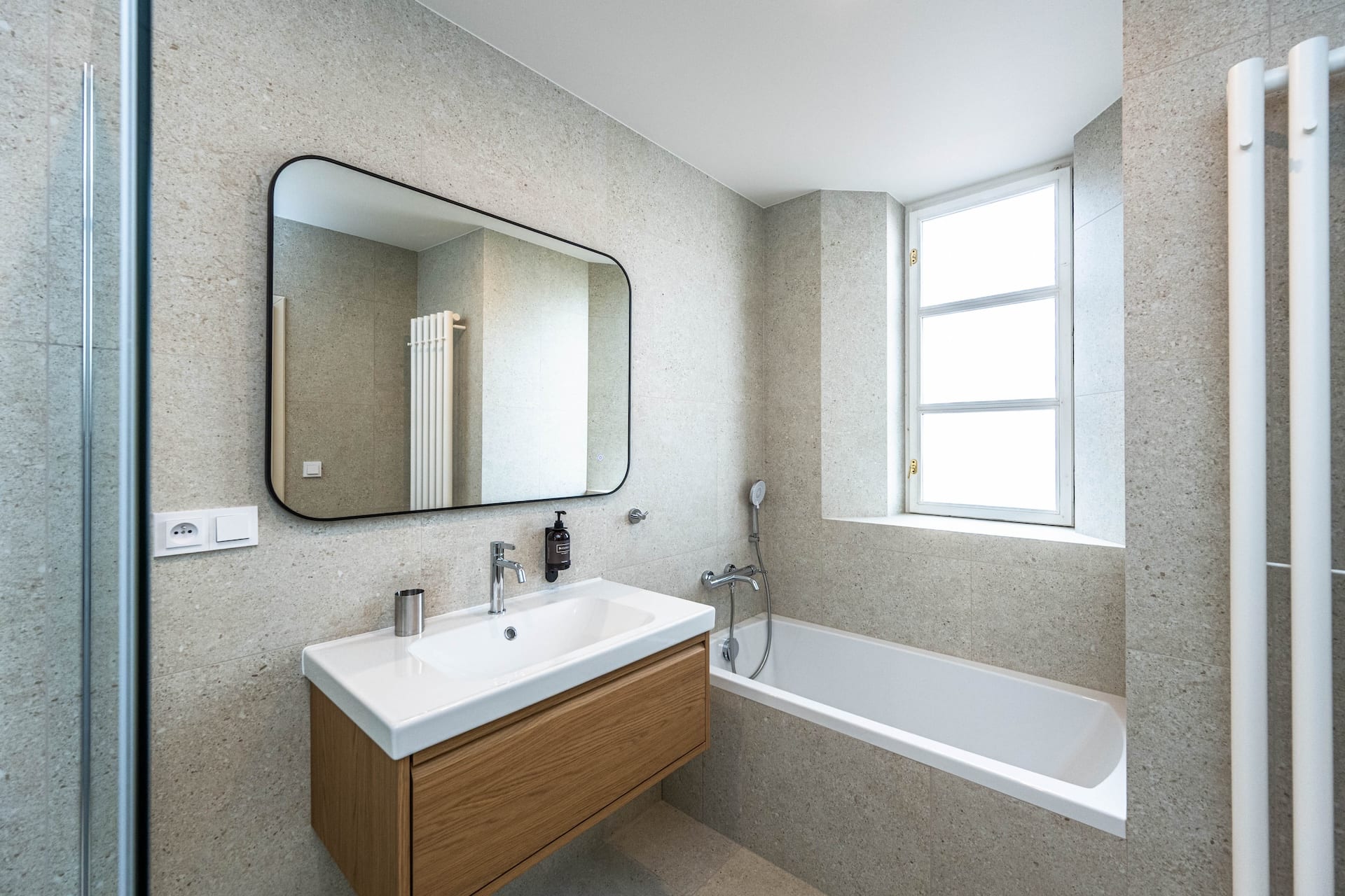 Tento byt s dvěma ložnicemi o rozloze 84 m² se pyšní stylovým designem. Nachází se ve čtvrtém patře budovy s výtahem a nabízí promyšleně navrženou dispozici. Dvě ložnice s manželskými lůžky a šatními skříněmi vytvářejí útulné útočiště. Pohodlná pohovka vítá hosty v příjemném obývacím pokoji, zatímco vyhrazený jídelní kout přidává další úroveň komfortu během vašich jídel. Byt se může pochlubit dalším fantastickým prvkem – prostornou, soukromou a zařízenou terasou, ideální pro večeře a posezení s přáteli.